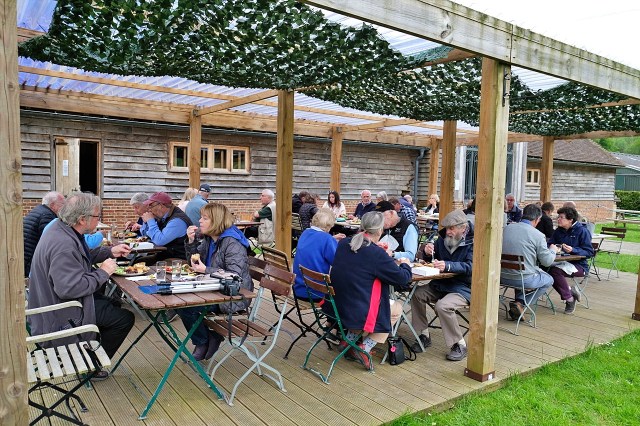 Returning t the cafe in an old barn we found that John Davies had prepared all the trophies for our 2022 awards to be presented al fresco.